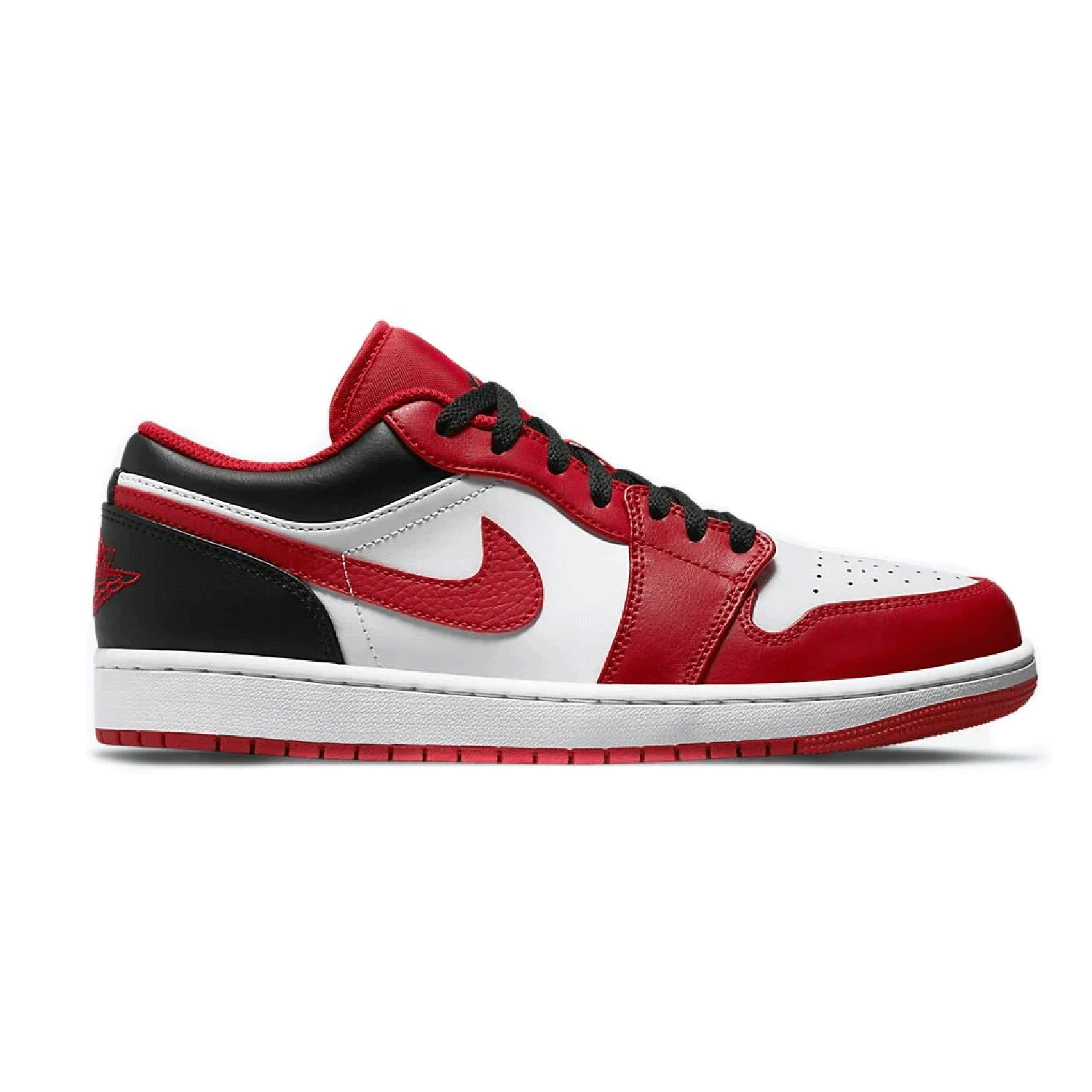 The Air Jordan 1 Low ‘Reverse Black Toe’ delivers a flipped colorway of the iconic OG colorway from 1985. The Chicago-inspired design features a leather upper that combines a crisp white base with Gym Red accents on the forefoot overlay and signature Swoosh. Contrasting hits of black land on the low-cut collar and heel overlay, marked with retro Wings logo in crimson embroidery. Jumpman branding adorns the tongue and sockliner. The low-top is mounted on a durable rubber cupsole, fitted with an encapsulated Air-sole unit in the heel.