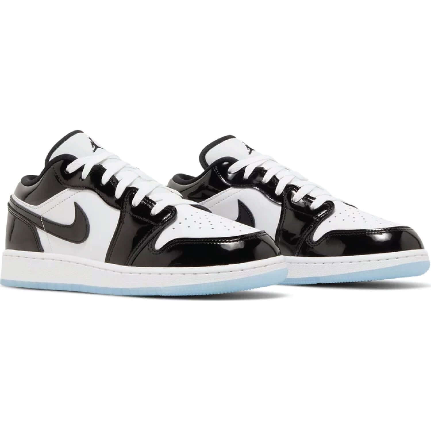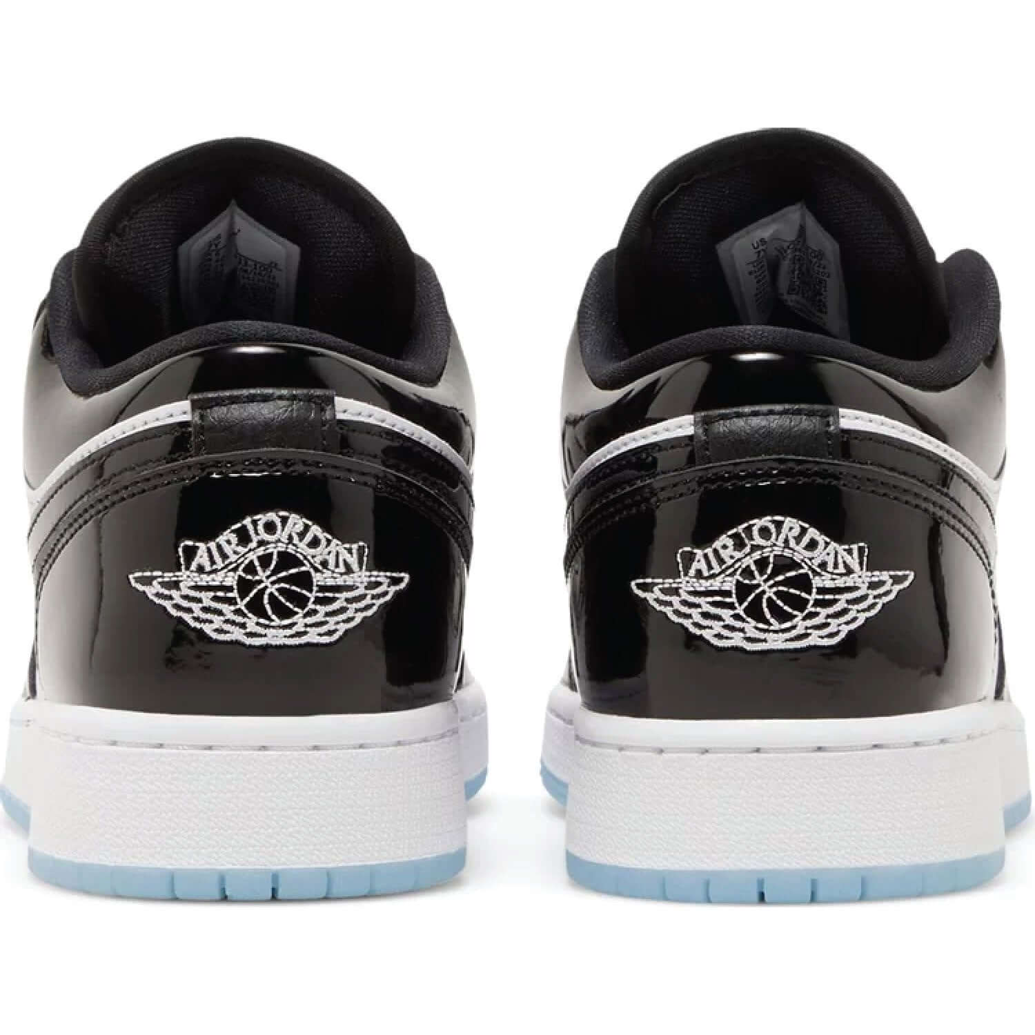 Seen here is the Air Jordan 1 Low SE GS 'Concord' combining the epic “Concord” — as seen by the piano black patent leather and icy outsole — with the “Bred” — visible via the black/red heel portion. Together, the form an outstanding colorway that captures the greatness of MJ and the Bulls, while the large Jumpman on the tongue leaves no mystery in regards to brand alliance.