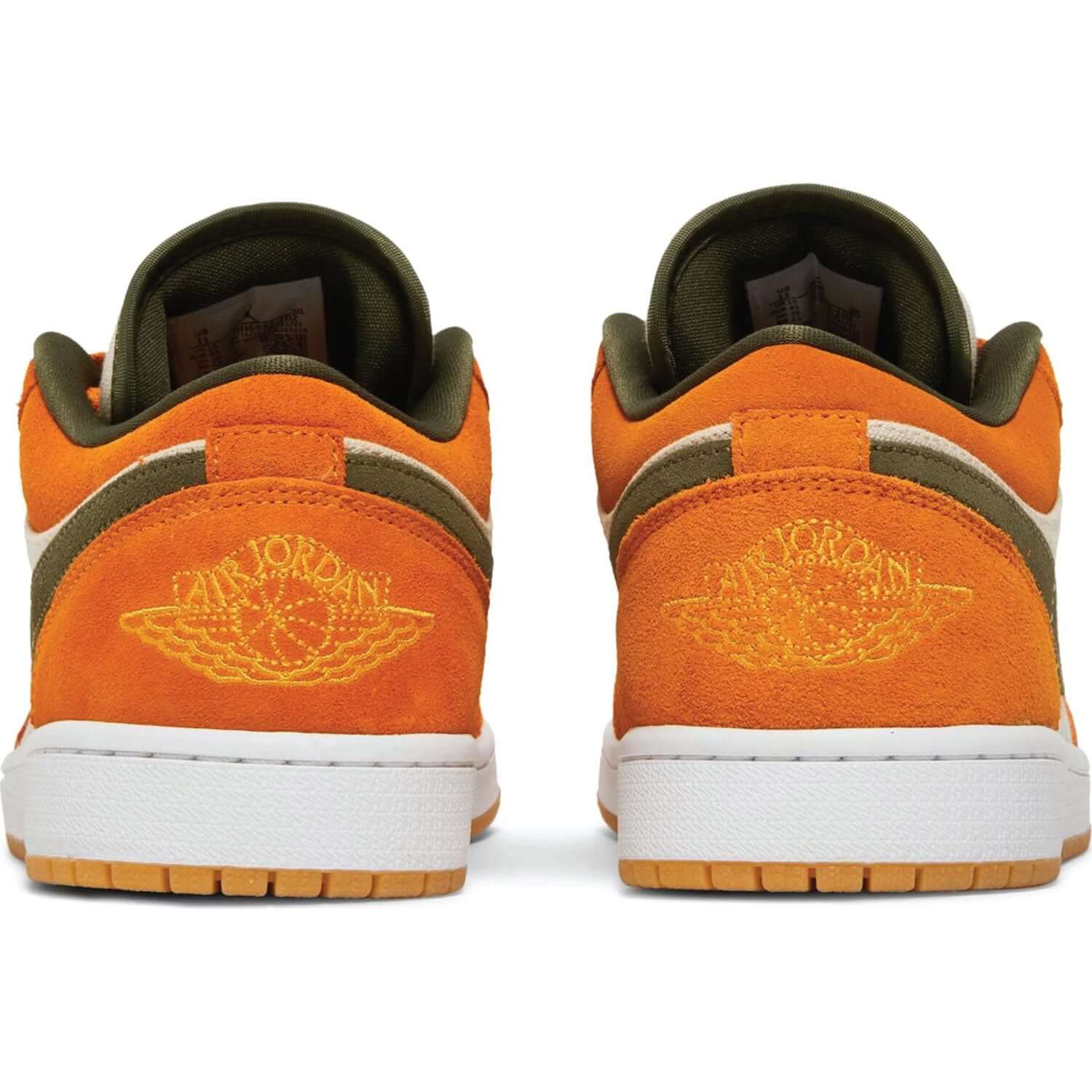 A bright orange similar to the aforementioned — if not just a bit brighter — dyes many of the suede overlays. The laces, then, are colored to match, while the tread below loosely complements in its gum finish. Elsewhere, the base, whose typical leather construction is swapped out for canvas, is kept a light cream, which acts as a neutral companion to the aforementioned warm tone as well as the dark olive that dresses the Swoosh, Jumpman, and lining.