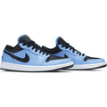The Air Jordan 1 Low 'University Blue Black' gives a new iteration of the iconic sneaker form, redesigned in University Blue and Black. Its upper spotlights a leather base with overlays and the standard Wings’ Logo. On the upper, a Swoosh emphasizes the design with a breathable nylon tongue. The midsole is built on top of a rubber outsole with a circular build for traction.