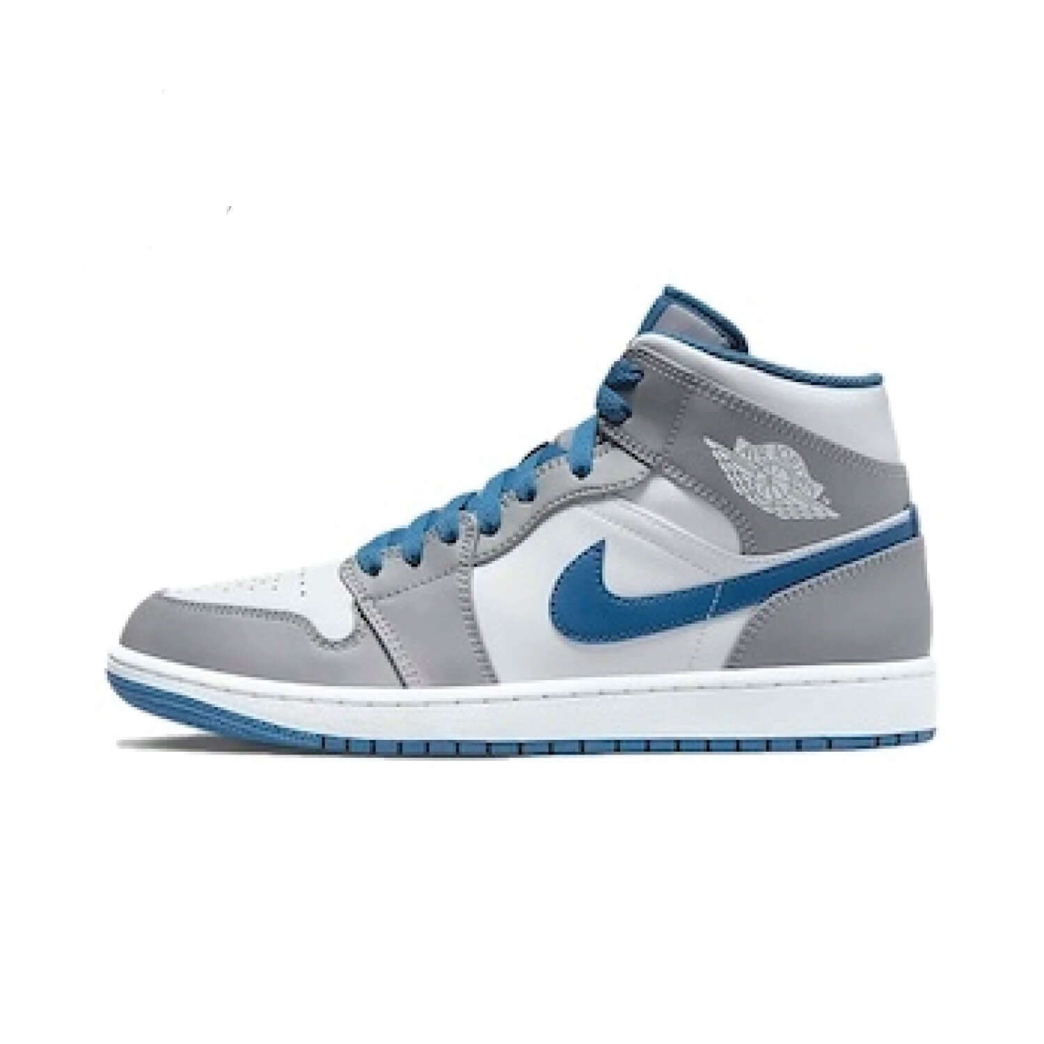 Embrace a classic look with the Jordan 1 Mid 'Cement True Blue.' This sneaker features a crisp white upper with true blue and cement grey accents. The mid-top design ensures support and comfort, making it a perfect addition to any sneaker collection.