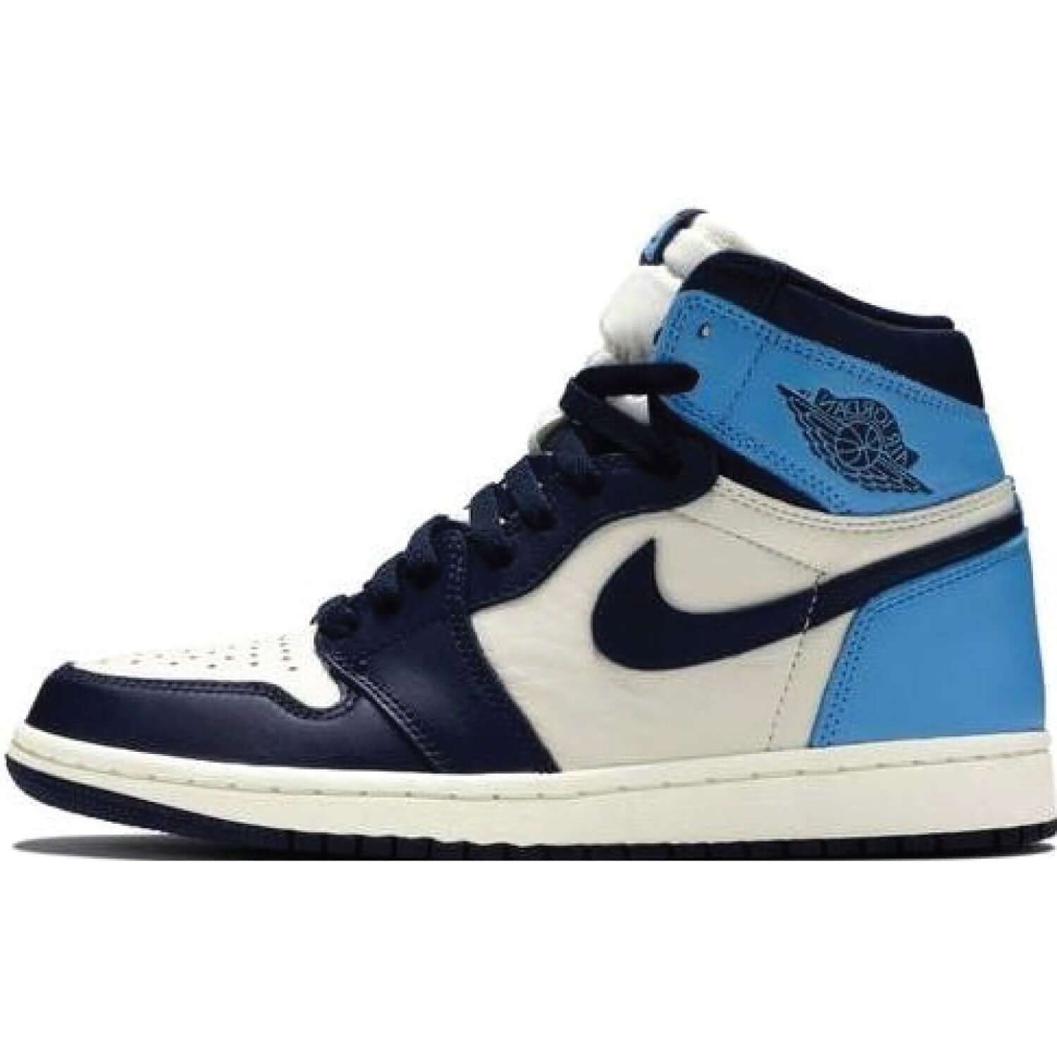 The Air Jordan 1 High OG Obsidian UNC is a stylish and modern take on the classic Jordan 1 silhouette. The shoe features a combination of white, dark blue, and light blue leather on the upper, with the dark blue colorway taking up most of the shoe. The Nike Swoosh, collar, and toe box are white, while the tongue and heel tab are light blue with white Nike and Jordan branding. The shoe sits atop a white midsole with a blue outsole. It's a comfortable and fashionable sneaker that can be worn for both casual and athletic occasions.