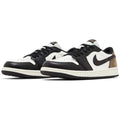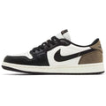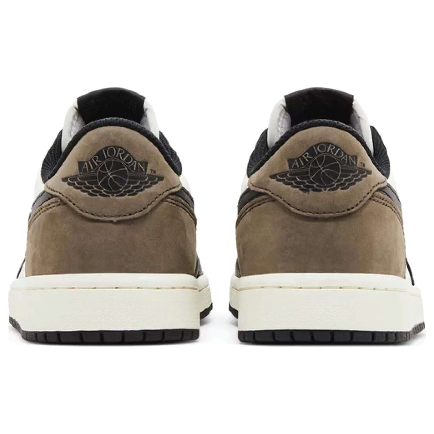 The Air Jordan 1 Retro Low OG 'Mocha' features a white leather upper with contrasting black accents on the forefoot overlay and Swoosh. Brown nubuck wraps the heel overlay and back tab, marked with a Wings logo in black. The woven tongue tag and sockliner. A subtle off-white finish coats the midsole, fitted with encapsulated Air-sole cushioning and supported by a black rubber outsole.