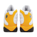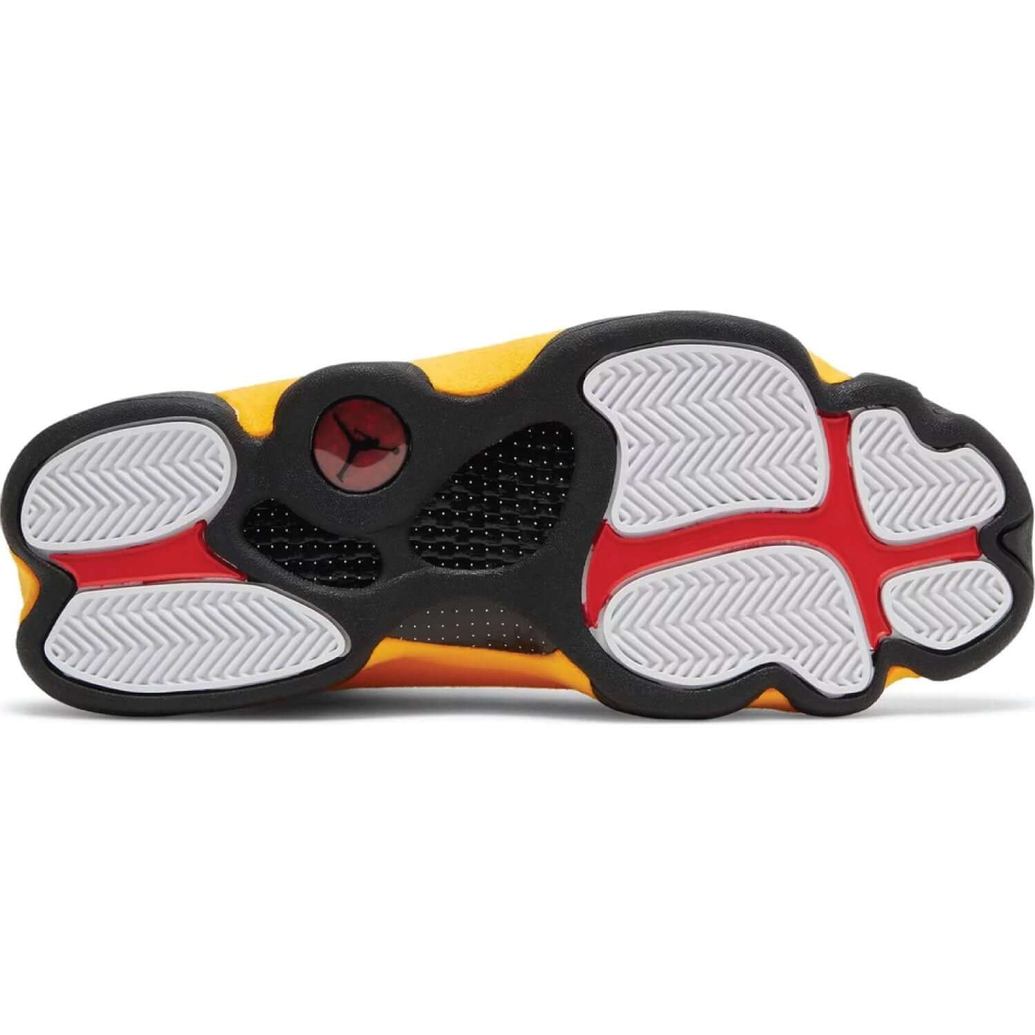 The Air Jordan 13 Retro ‘Del Sol’ combines sunny accents with OG-inspired color blocking and materials. The mid-top carries a white leather upper with dimpled overlays in matching white tumbled leather. A crimson Jumpman logo graces the tongue, while a green-tinged holographic cat eye adorns the lateral ankle. Yellow synthetic suede wraps the midfoot, heel, and lightweight Phylon midsole, fitted with Zoom Air cushioning in the forefoot and heel. Underfoot, the black panther-paw outsole features herringbone rubber pods and a carbon fiber shank plate.