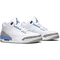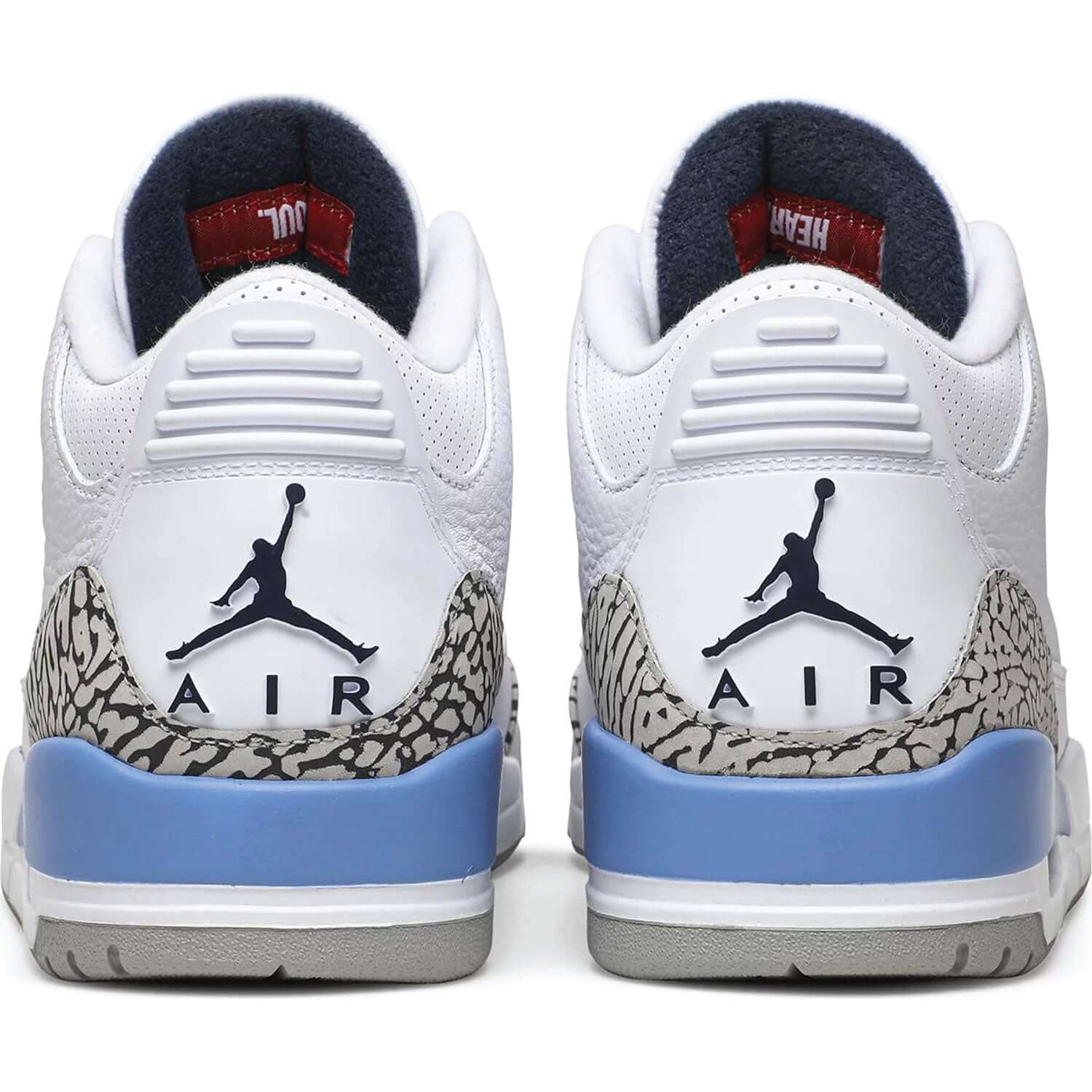 The Air Jordan 3 Retro UNC is a stylish and popular shoe with a combination of white, blue, and gray colors. The upper is made of leather and nubuck, with blue accents on the eyelets, heel tab, and Jumpman logo on the tongue. The Jordan 3 Retro UNC also features a visible air sole unit in the heel for cushioning and a rubber outsole for traction. This Air Jordan 3 Retro UNC is perfect for basketball players or anyone who wants to make a fashion statement. The Jordan 3 Retro UNC is a limited edition release that was first introduced in 2020. The AJ 3 Retro UNC also features a signature elephant print on the toe and heel, which adds to its unique and stylish design. The Air Jordan 3 Retro UNC is a great addition to any sneaker collection. The Air Jordan 3 Retro UNC pays tribute to Michael Jordan's alma mater, the University of North Carolina. The Air Jordan 3 Retro UNC is a great shoe for basketball players or those looking to show their support for the Tar Heels. The Jordan 3 Retro UNC is also comfortable and durable, making it an excellent choice for everyday wear.