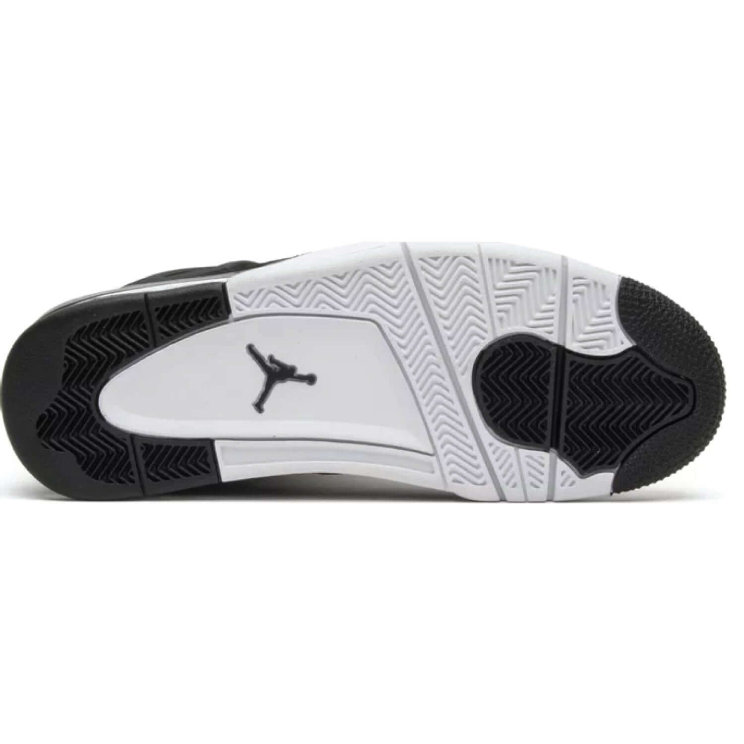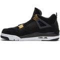 The Air Jordan 4 Retro ‘Royalty’ pairs a monochromatic black suede upper with contrasting metallic gold accents. They shine on the signature molded eyelets and a Jumpman icon on the synthetic leather heel panel. Additional Jumpman branding lands on the woven tongue tag and rubber outsole, featuring a traditional herringbone traction pattern for optimal grip.
