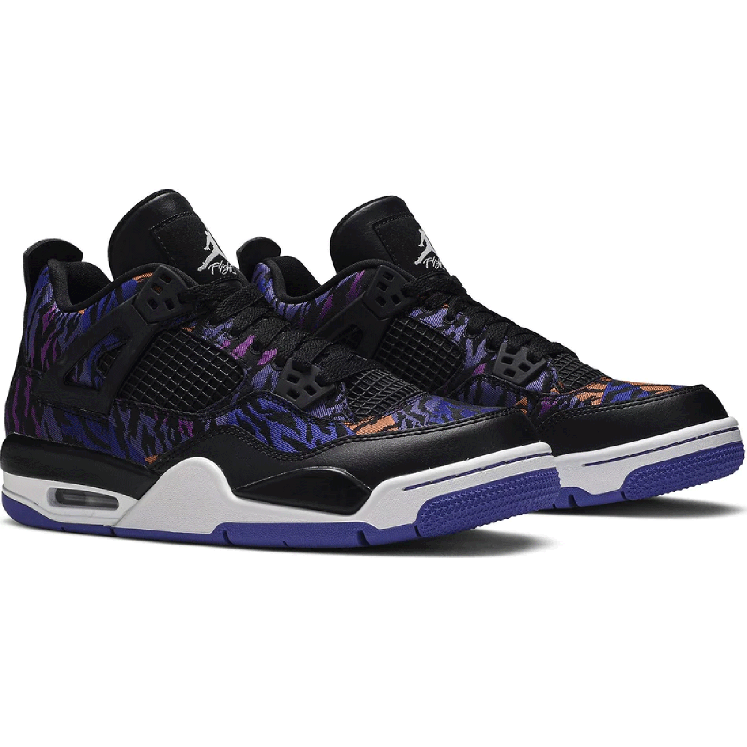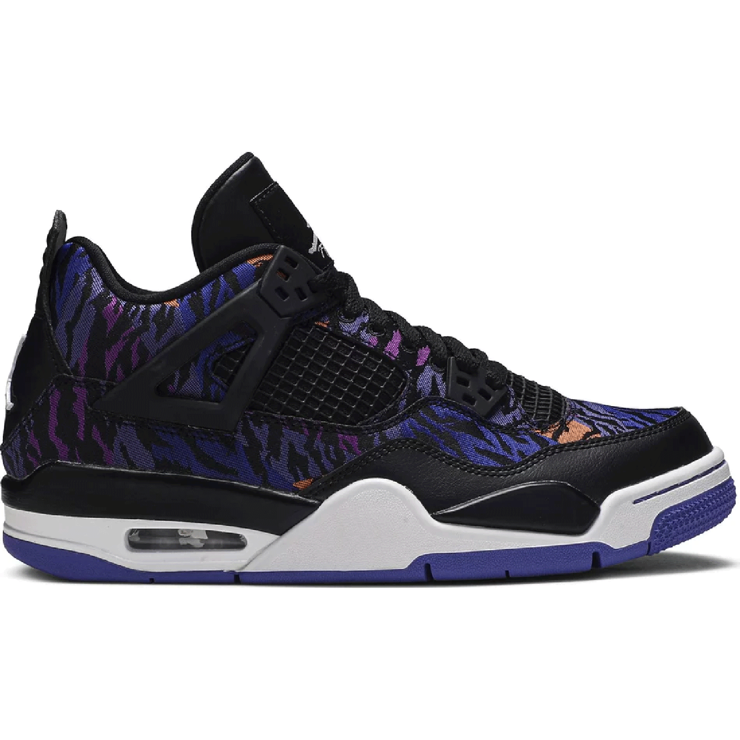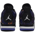 The Nike Air Jordan 4 Retro SE GG is a kids-unique presenting Michael Jordan's iconic signature in a playful light. Revealed in November 2019, this edition dons a tiger-striped textile upper with leather paneling, mesh inserts and premium lace wings. Jordan Flight branding remains on the tongue and heel. The sneaker sits on an Air-equipped midsole and herringbone-patterned rubber outsole in Rush Violet.