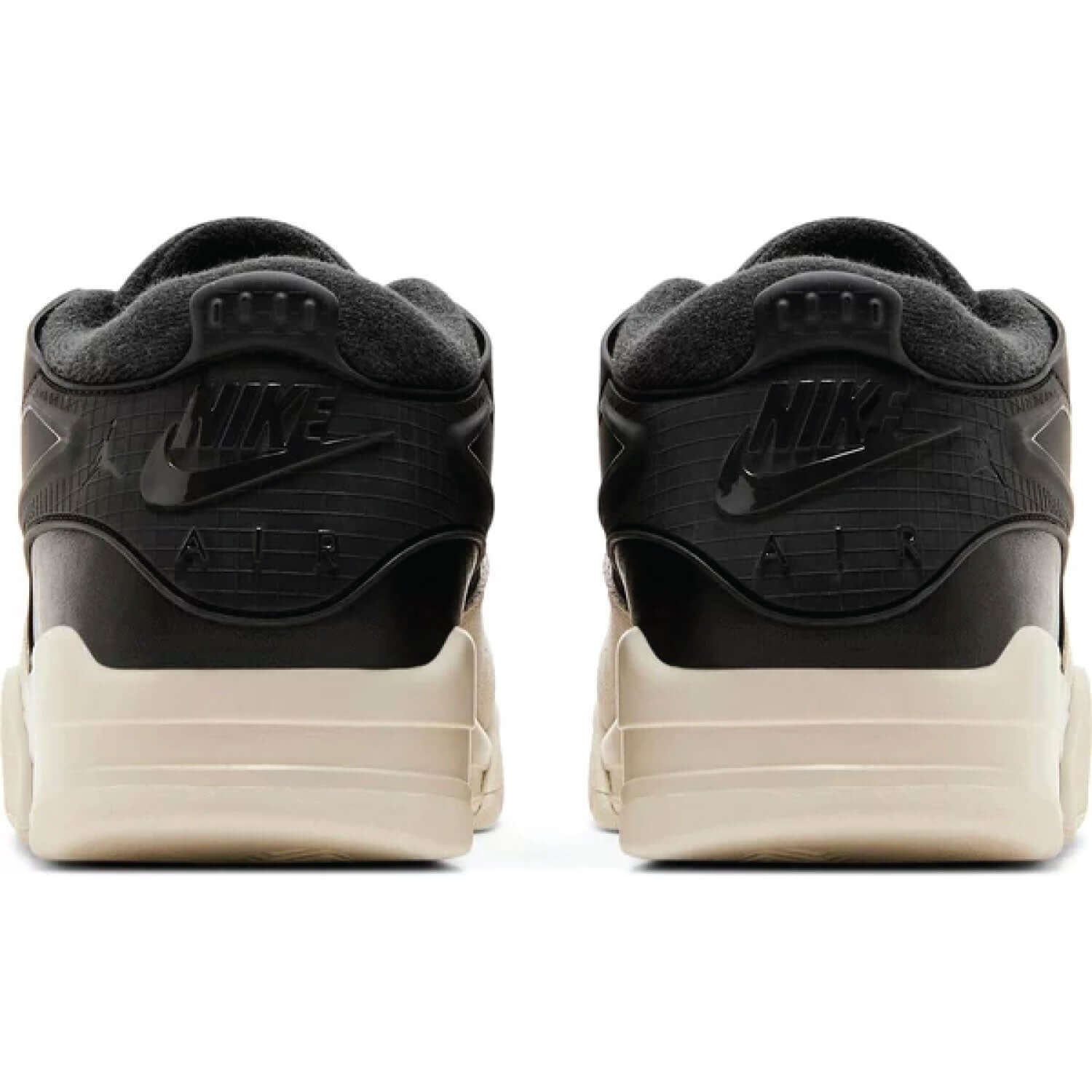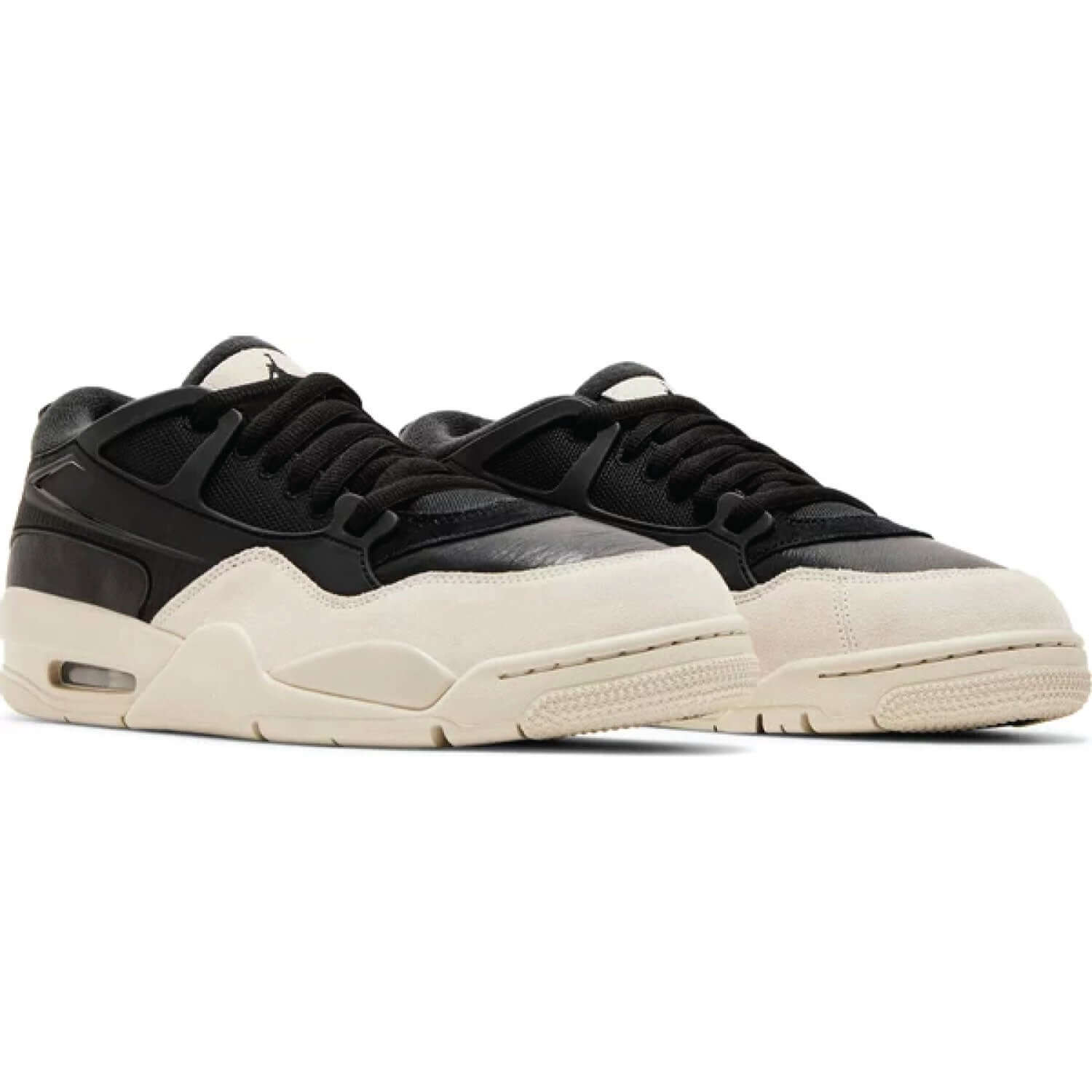 The Air Jordan 4 RM 'Black Light Bone' delivers a reimagined AJ4, featuring a low-top design in a versatile two-tone color scheme. A solid black finish is executed on the leather and textile upper, fortified with a tonal TPU cage that wraps around the heel. The latter displays embossed Nike Air branding. Off-white suede is utilized on the forefoot overlay, matching the Jumpman tongue tag and lightweight polyurethane midsole, augmented with a visible Air-sole heel unit and supported by a herringbone-traction rubber outsole.