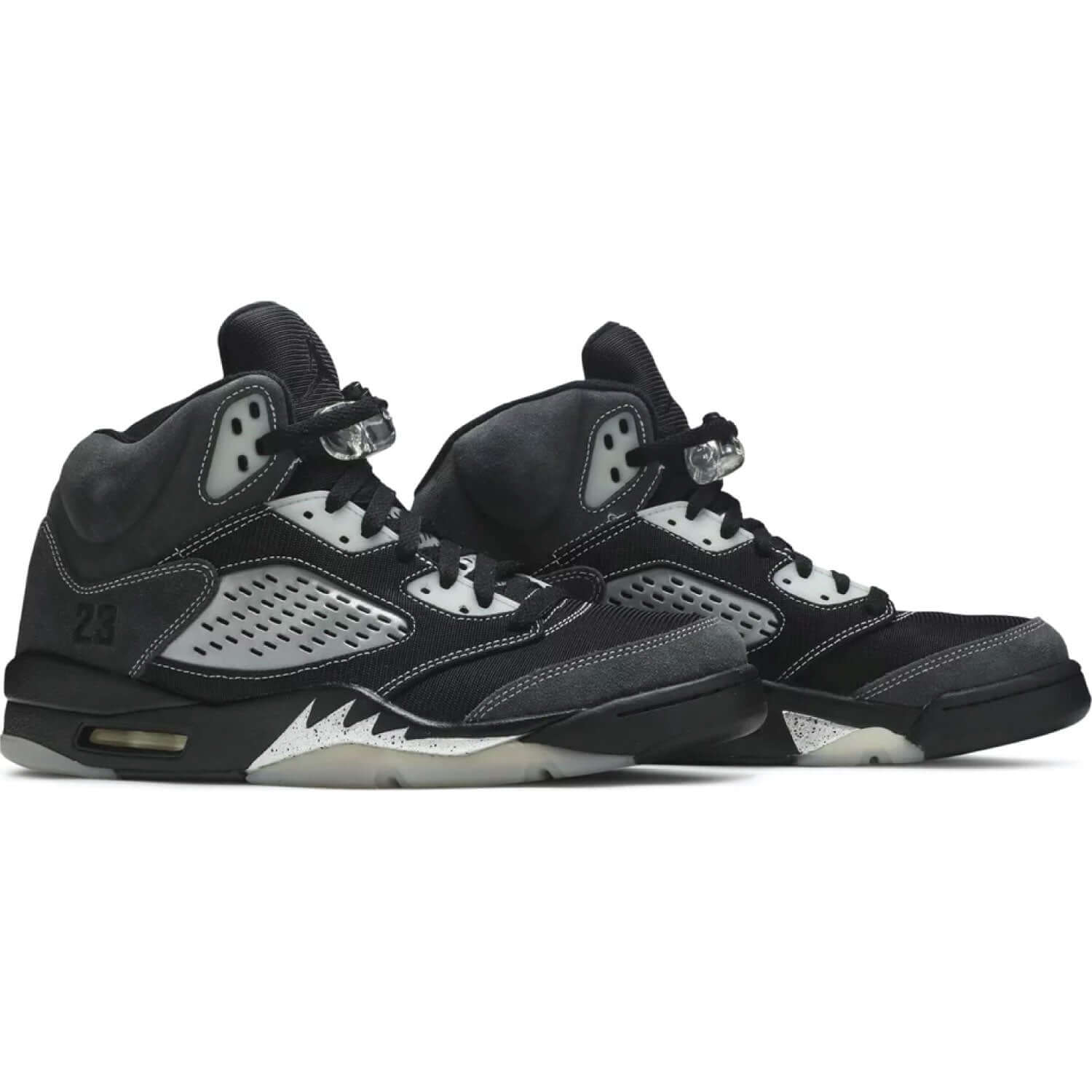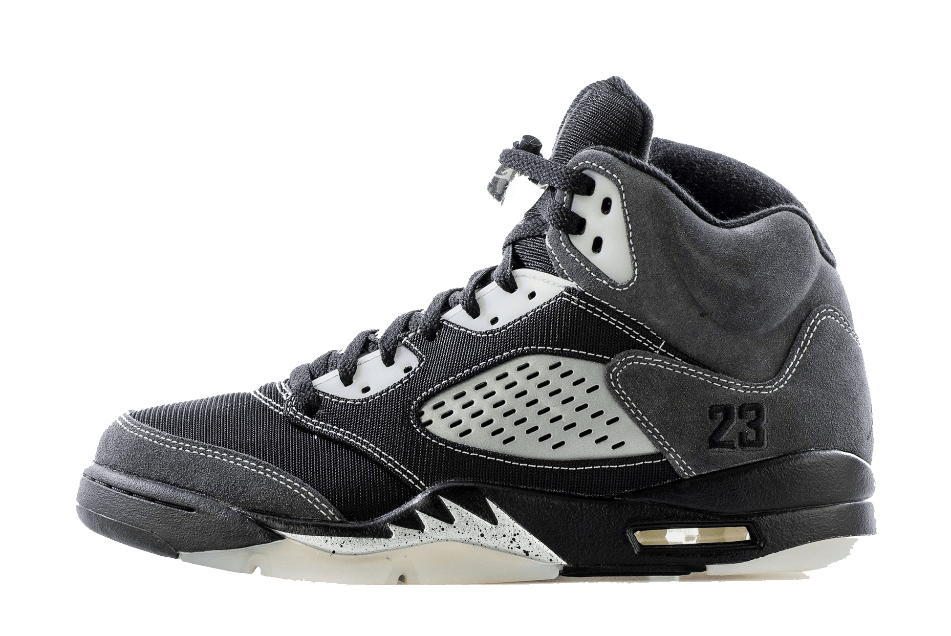 The Air Jordan 5 Retro ‘Anthracite’ delivers a reconfigured version of the classic silhouette. Standard design hallmarks of the Air Jordan 5 — including ‘23’ branding on the lateral heel and shark-tooth detailing on the midsole — decorate an unorthodox build that combines soft suede with breathable textile on the vamp and midfoot. Reflective treatment typically found on the tongue is relocated to the matte silver quarter panel, featuring oblong perforations that replicate the shoe’s traditional netting.