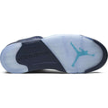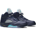The Air Jordan 5 'Pre-Grape' is influenced by a sample from Tinker Hatfield in 1990 to be released instead of the iconic 'Grape' colorway. The sneaker features an upper, gray and turquoise leather of the Midnight Navy and a reflective tongue of 3M. The structure also features turquoise shark teeth and an icy blue translucent outsole, released in May 2015.