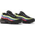 This Air Max 95 start off with a Black mesh construction on the base of the upper which is then quickly contrasted by neon shades of volt, blue, and pink/red across the side panels. Grey ribbon eyelets, black Swooshes on the lateral ankles, and white ans volt branding on the tongues and heels wrap up the look on the upper. 3M reflective detailing on the heels and full black rubber soles cap off the look on this grade school colorway of the Air Max 95.
