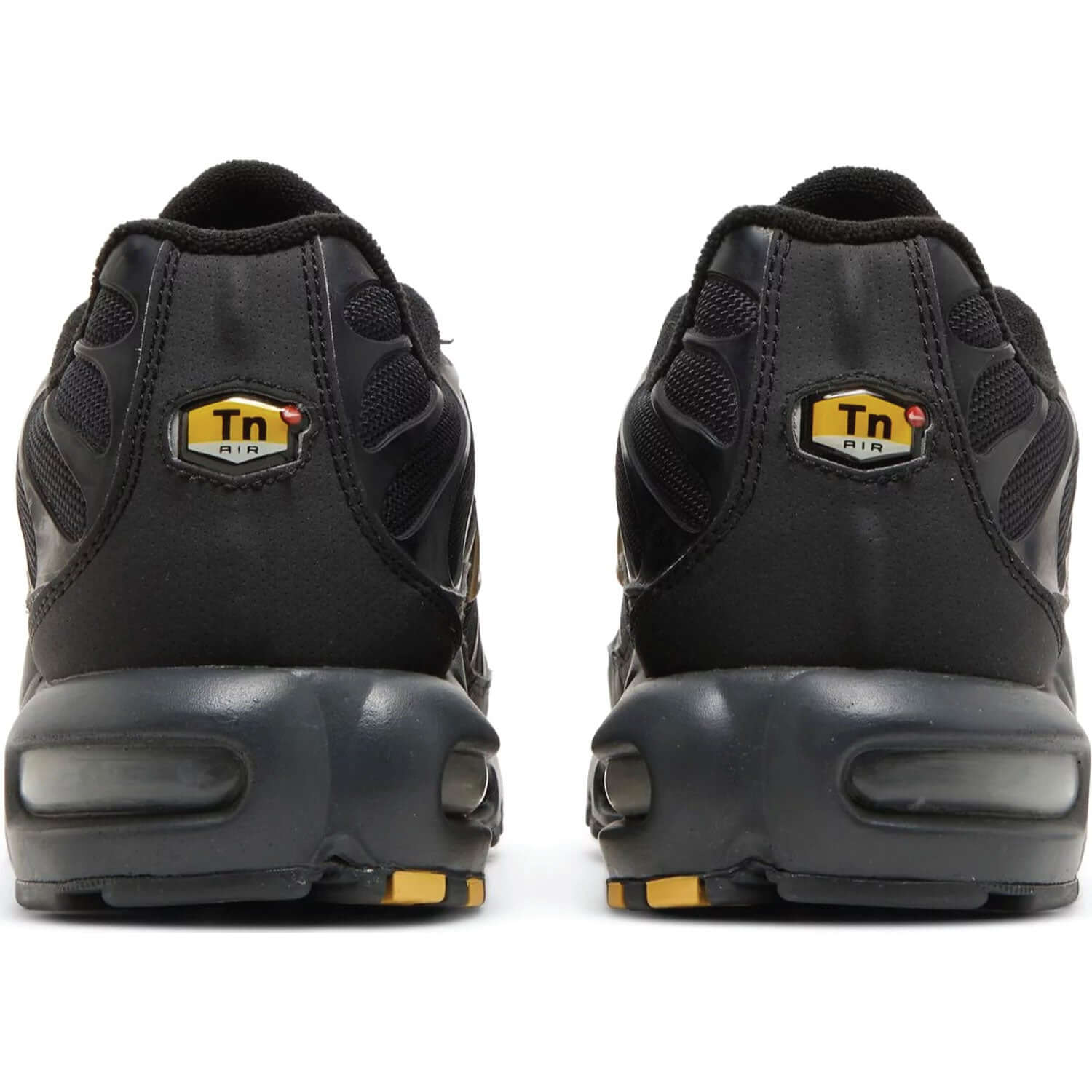 The Air Max Plus TN 'Black Metallic Gold' was a Footlocker premium release in November 2018. Like Sean McDowell's original design, this model features a mesh upper with welded TPU overlays. The shoe is dipped almost entirely in black, enabling Tuned Air branding and a Metallic Gold Swoosh to shine. Classic Tuned Air cushioning rides below with varying pressures to help prevent pronation and blacked-out windows for a stealthy look.