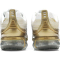 The Air Vapormax 360 'White Metallic Gold' is a stylish and eye-catching sneaker design that combines comfort, performance, and aesthetic appeal. It is a part of Nike's popular Air Vapormax line of footwear, known for its innovative cushioning system and sleek design. The upper of the shoe is predominantly white, giving it a clean and fresh look. It is constructed with a combination of breathable mesh and synthetic materials, providing a lightweight and comfortable feel. The mesh allows for enhanced airflow, keeping your feet cool and dry even during intense activities. One of the standout features of the Air Vapormax 360 is the metallic gold accents that add a touch of luxury and elegance to the overall design. The shoe is built with a full-length Vapormax Air unit, which is visible through the transparent outsole. This unique cushioning system provides responsive and lightweight comfort, absorbing impact and delivering a bouncy feel with each step. It also offers excellent flexibility, allowing for a natural range of motion. The Air Vapormax 360 'White Metallic Gold' features a lace-up closure system that allows for a secure and personalized fit. Overall, the Air Vapormax 360 'White Metallic Gold' is a stylish and performance-driven sneaker with a clean white upper and eye-catching metallic gold accents.