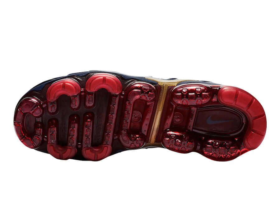 The Air VaporMax Plus 'Midnight Navy/Metallic Gold-Black' was designed by Nike and it was first released on January 05, 2019. The Air VaporMax Plus 'Midnight Navy/Metallic Gold-Black' is a stylish and eye-catching sneaker from Nike's Air VaporMax line. The primary color used in this particular model is 'Midnight Navy,' which is a rich, dark blue shade resembling the color of the night sky. The secondary color, 'Metallic Gold,' is a lustrous and vibrant gold tone that adds a touch of luxury and flash to the design. 'Black' is used as an accent color throughout the shoe, providing contrast and further enhancing its overall aesthetic. The Air VaporMax Plus 'Midnight Navy/Metallic Gold-Black' combines elements from two popular Nike silhouettes. The midsole of the Air VaporMax Plus incorporates Nike's revolutionary VaporMax technology. It features individual Air cushioning units placed strategically throughout the sole, offering responsive and lightweight cushioning. The transparent Air units give the impression of walking on air and create a distinctive visual effect. Additionally, the shoe features a black lacing system and a black heel pull tab for ease of wearing and removal.