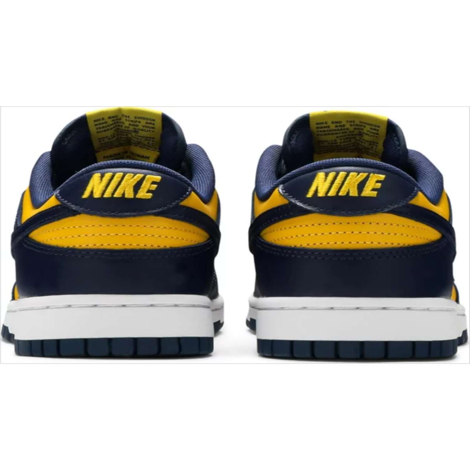 The 2021 Nike Dunk Low 'Michigan' offers a low-top version of one of the silhouette's original 'Be True to Your School' colorways, first released in 1985 and previously retroed in 2020. The all-leather upper arrives in a rich Varsity Maize hue with contrasting Midnight Navy accents on the Swoosh and forefoot and heel overlay. A low-cut collar and breathable nylon tongue bearing traditional Nike branding ensure padded comfort.