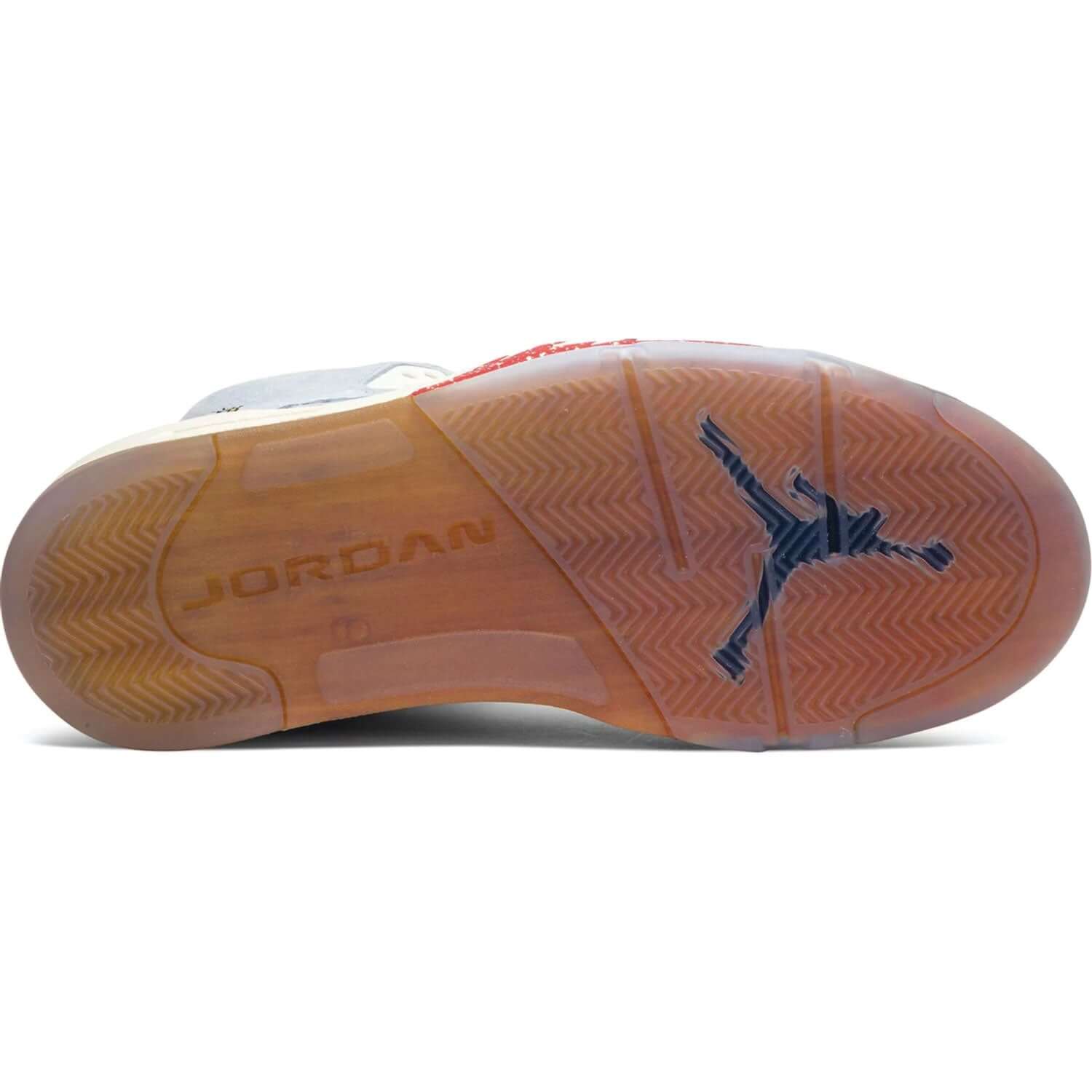 The Trophy Room x Air Jordan 5 Retro sneaker draws inspiration from the real-life trophy room in the Jordan family home. This 'Ice Blue' rendition is replete with a rich suede upper, hits of University Red, Sail and a metallic gold lace lock. Each lateral heel is embroidered with metallic gold numerals—'23' and '5'—the jersey numbers worn by MJ and his son, Marcus. Below, the sneaker's translucent rubber sole displays a wood-grain motif to reference the court-style flooring in MJ's trophy room. A total of 7,000 pairs were released in May 2019, each individually numbered.